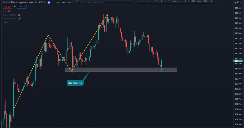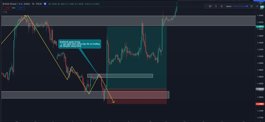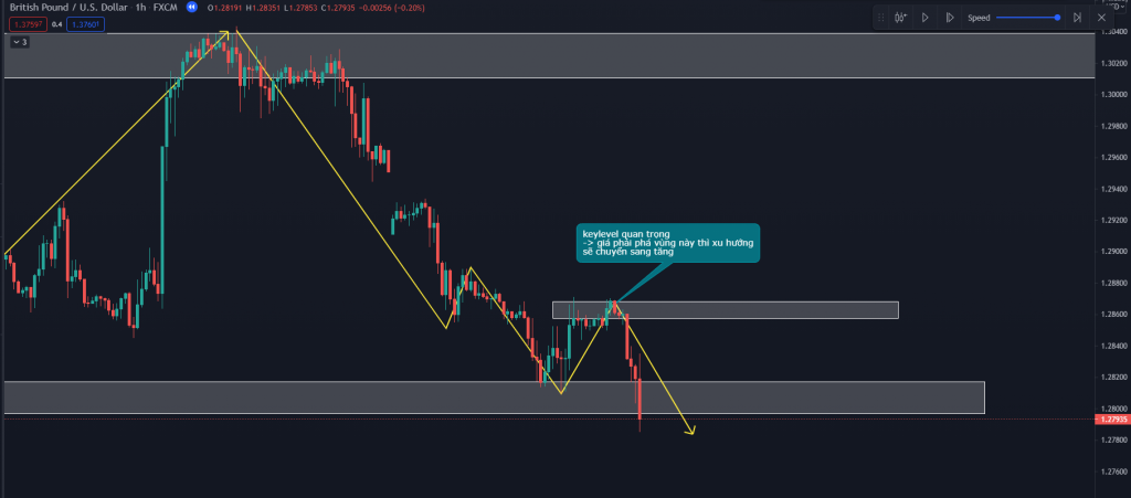 Dấu hiệu đảo chiều xu hướng tiếp theo là giá phá qua keylevel của khung H1