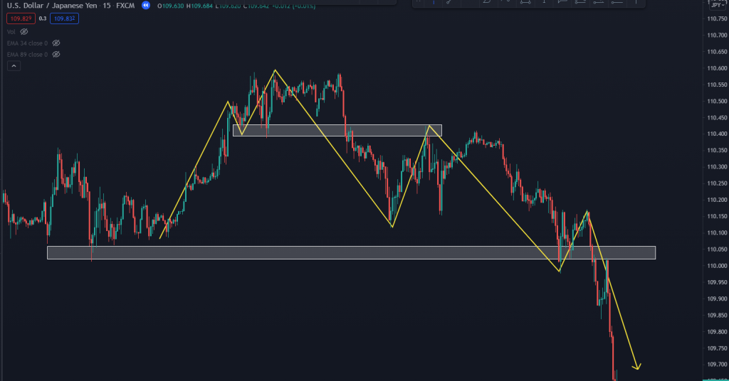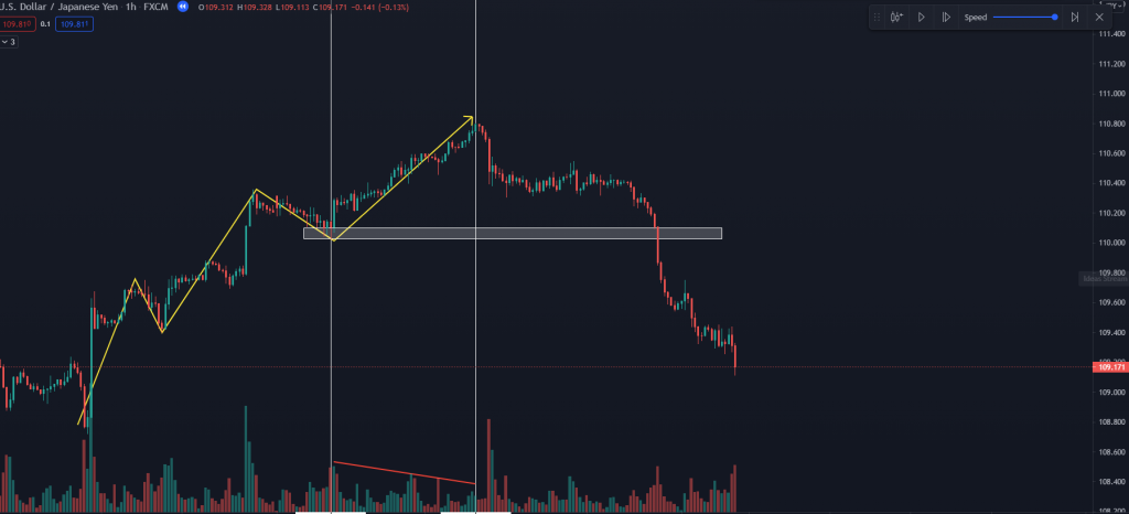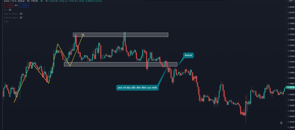 - Đối với xu hướng tăng: Trong một hướng giá di chuyển giá có thể tạo ra các đỉnh và đáy cao dần lên. Và một điều đặc biệt là trong hướng giá đó có rất nhiều đáy nhỏ được tạo ra nhưng chỉ có một đáy quan trọng nhất quyết định tạo nên xu thay đổi cấu trúc là đáy dẫn đến đỉnh cao nhất trong con sóng đó. Dấu hiệu xu hướng bị phá vỡ khi và chỉ khi giá quá được qua đáy đó retest lại đáy đó và tạo ra đỉnh thấp hơn. Cùng xem ví dụ dưới đây ta thấy giá đang tạo ra các đỉnh và các đáy cao dần. Dấu hiệu đầu tiên của sự phá vỡ là giá không thể tạo ra một đỉnh cao hơn sau đó giá đi xuống phá qua đáy dẫn đỉnh cao nhất và retest lại đáy đó tạo ra đỉnh thấp hơn lúc này ta mới có thể khẳng định xu hướng tăng đã bị phá vỡ trở thành xu hướng giảm