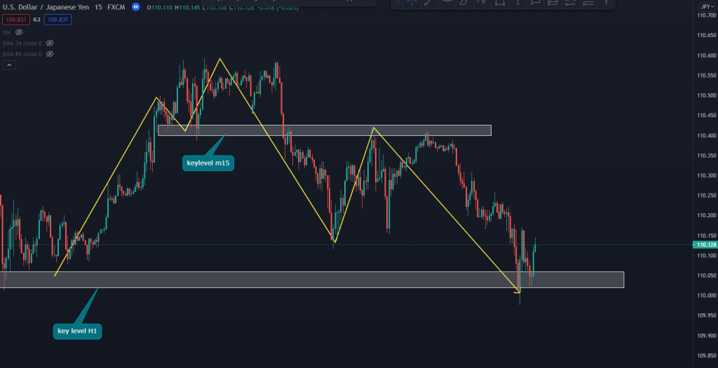 Đa số chúng ta sẽ đặt ra một câu hỏi là: “Chả lẽ cấu trúc khung lớn đang giảm thì khung nhỏ sẽ giảm theo hay sao? Vậy xu hướng giảm khi nào mới kết thúc?” Đây là câu hỏi mà rất nhiều trader thắc mắc khi bắt đầu phân tích thị trường. Cấu trúc thị trường xảy ra ở mọi khung thời gian và các khung đều có liên kết chặt chẽ với nhau. Chúng ta có thể nói là trước khi khung lớn đảo chiều thì khung nhỏ đã có sự đảo chiều trước, tuy nhiên vùng keylevel của khung lớn luôn có khả năng đảo chiều và bẻ gãy cấu trúc của khung nhỏ. Xem ví dụ ở đây bạn có thể thấy giá ở khung thời gian H1 đang là xu hướng tăng giá chưa phá được qua key level thì giá vẫn chưa đảo chiều (hình 1). Tuy nhiên khi bạn mở vào khung nhỏ hơn cụ thể ở đây là M15 ta thấy cấu trúc đã đảo chiều từ trước đó rồi giá đã phá qua đáy tạo nên đỉnh cao nhất trong khung thời gian này(hình 2). Đây là dấu hiệu đảo chiều xu hướng đầu tiên đã xảy ra khi giá chạm đến vùng keylevel của H1 bạn có thể thấy sau hai lần phản ứng giá đã thực sự đảo chiều xu hướng của H1.(Hình 3)