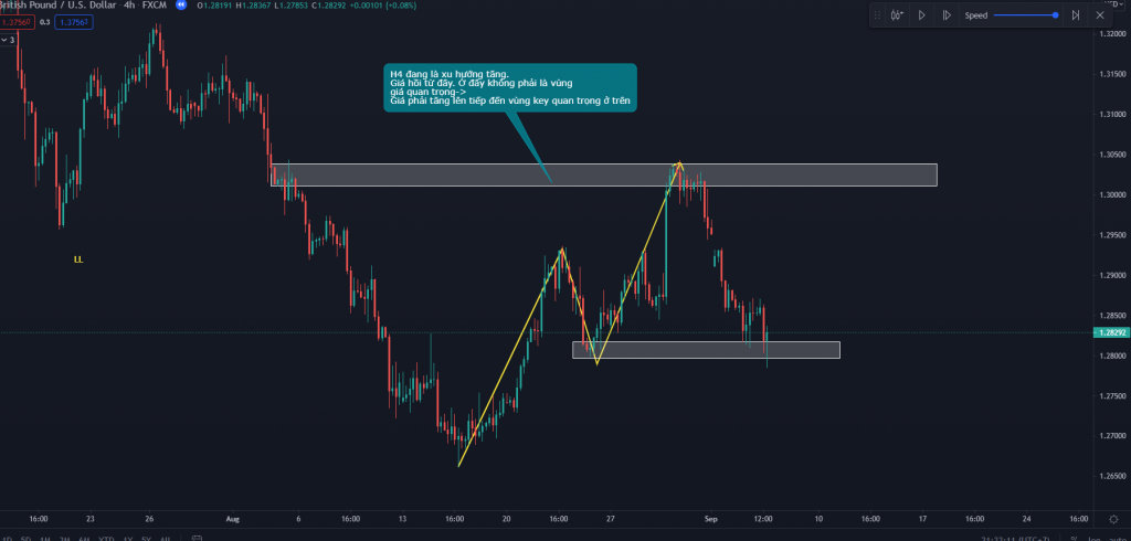 - Sau khi giá hồi về vùng keylevel quan trọng lúc này ta cần phân tích xem xu hướng tăng này còn tiếp tục hay không, ta có 2 yếu tố ủng hộ là: thứ nhất giá hồi về key phản ứng bằng nến pinbar rút chân đẹp, thứ hai vùng giá bắt đầu xu hướng hồi của H4 không phải là vùng quan trọng có nhiều lực bán để có thể đảo chiều xu hướng H4. Vì thế ta có đủ lí do để tin giá sẽ bắt đầu tăng lên từ đây.