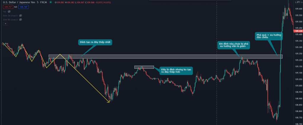 Đối với xu hướng giảm: Nhìn vào biểu đồ ta có thể thấy giá đang tạo ra các đỉnh và các đáy thấp dần. Bạn hãy xác định đâu là đỉnh dẫn đến đáy thấp nhất. Trong ví dụ này mình có đưa vào một đỉnh nhiễu vì đỉnh này không đóng vai trò quan trọng trong con sóng giảm này, đây chính là các chuyển động nhỏ kèm theo trong xu hướng thứ cấp trong lí thuyết Dow có nói ở trên. Bạn có thấy mặc dù giá phá qua đỉnh này nhưng khi giá chạm đến đỉnh tạo ra đáy thấp nhất giá vẫn tiếp tục xu hướng giảm cho đến khi giá chính thức phá qua đỉnh này xu hướng mới thực sự đảo chiều. Bạn cần phải xác định đúng đỉnh tạo ra đáy thấp nhất nếu không muốn bị vào lệnh sai xu hướng