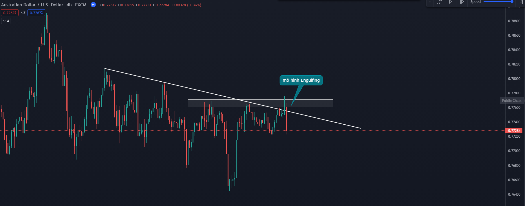 Các mô hình nến là công cụ rất phổ biến và mạnh mẽ được các trader sử dụng để tìm kiếm các điểm vào lệnh và tín hiệu giao dịch trong forex trading. Có rất nhiều mẫu hình nến khác nhau, tuy nhiên các mô hình nến như engulfing and shooting star thường được các nhà giao dịch có kinh nghiệm sử dụng. Trong ví dụ dưới đây, mô hình nến engulfing có thể được coi là điểm vào kích hoạt đảo chiều trên cặp AUDUSD.
