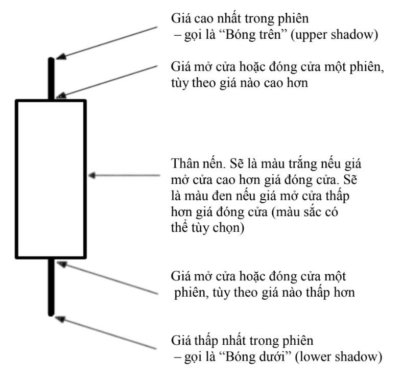 Mô hình nến Nhật biểu hiện đầy đủ nhất cả 4 yếu tố quan trọng nhất trong một phiên giao dịch. Mỗi cây nến thể hiện một phiên (1D, H4, H1, 5m, …) tuỳ theo lựa chọn khung thời gian của người sử dụng. Có thể quan sát cấu tạo của một cây nến như sau: