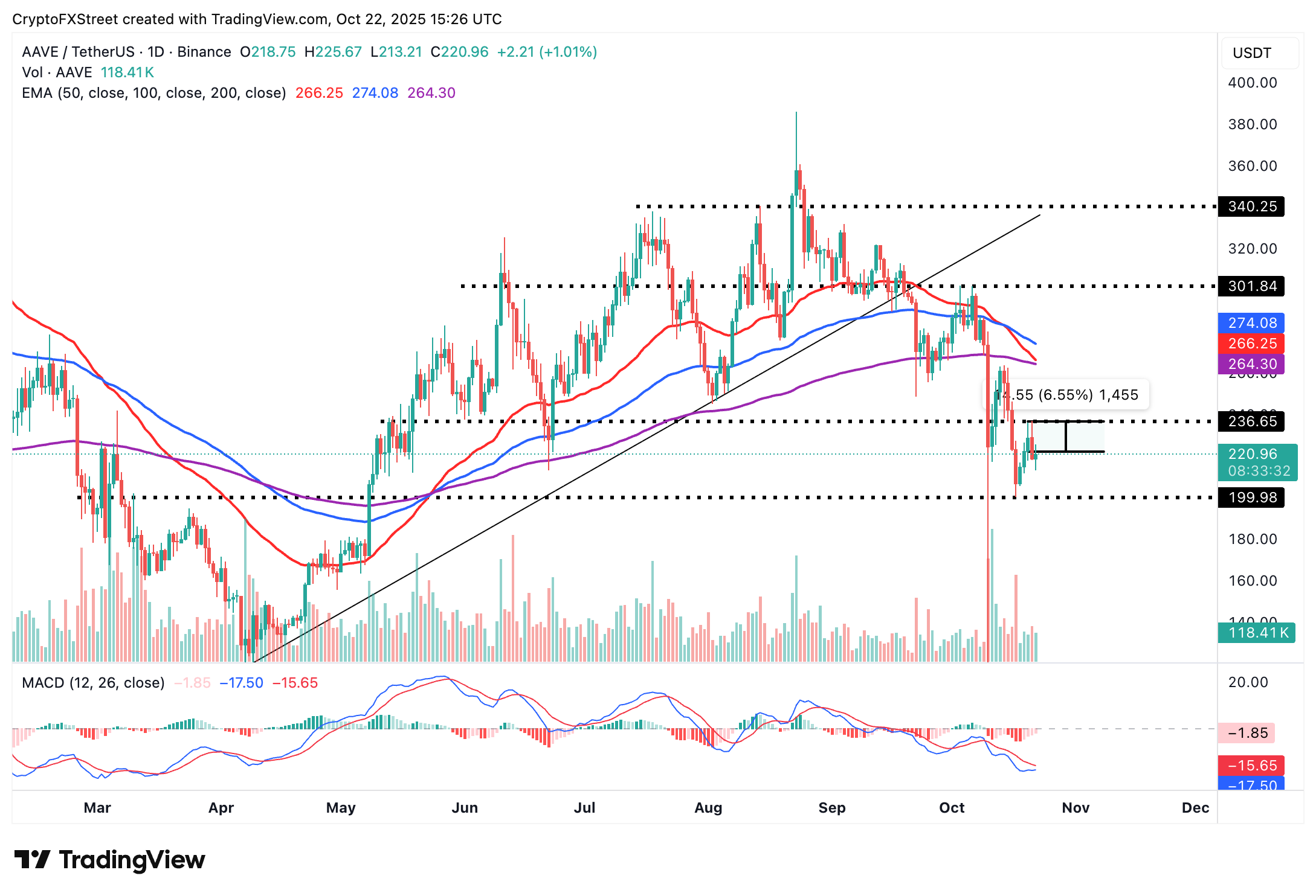 Aave (AAVE) lấy lại đà tăng, giao dịch trên mức 220 đô la vào thứ Tư, trong bối cảnh thị trường tiền điện tử nói chung đang giảm. Nỗ lực vượt qua ngưỡng cản 236 đô la đã không thành hiện thực sau đợt bán tháo xuống 200 đô la hôm thứ Sáu và cú sụp đổ chớp nhoáng xuống 80 đô la vào ngày 10 tháng 10. Tuy nhiên, việc đóng cửa phiên giao dịch trên mức 220 đô la ngay trước mắt sẽ củng cố triển vọng tăng giá ngắn hạn của AAVE .