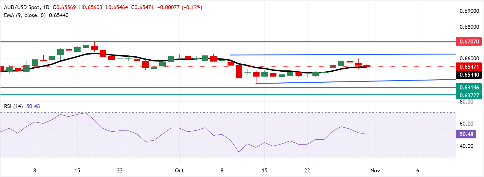 Cặp AUD/USD đang giao dịch quanh mức 0,6550 vào thứ Sáu. Phân tích kỹ thuật trên biểu đồ hàng ngày cho thấy xu hướng trung lập khi cặp tiền này di chuyển trong mô hình hình chữ nhật. Cặp tiền này nằm trên đường Trung bình Động Hàm mũ (EMA) chín ngày, cho thấy cả hai động lực giá ngắn hạn đều mạnh hơn.