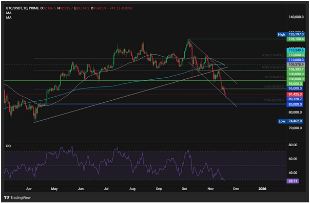 Bitcoin tiếp tục giảm, giảm 25% so với mức cao kỷ lục 126,2 nghìn vào đầu tháng 10, và giảm xuống mức thấp nhất là 89,1 nghìn vào hôm nay, mức thấp nhất được ghi nhận vào tháng 4.