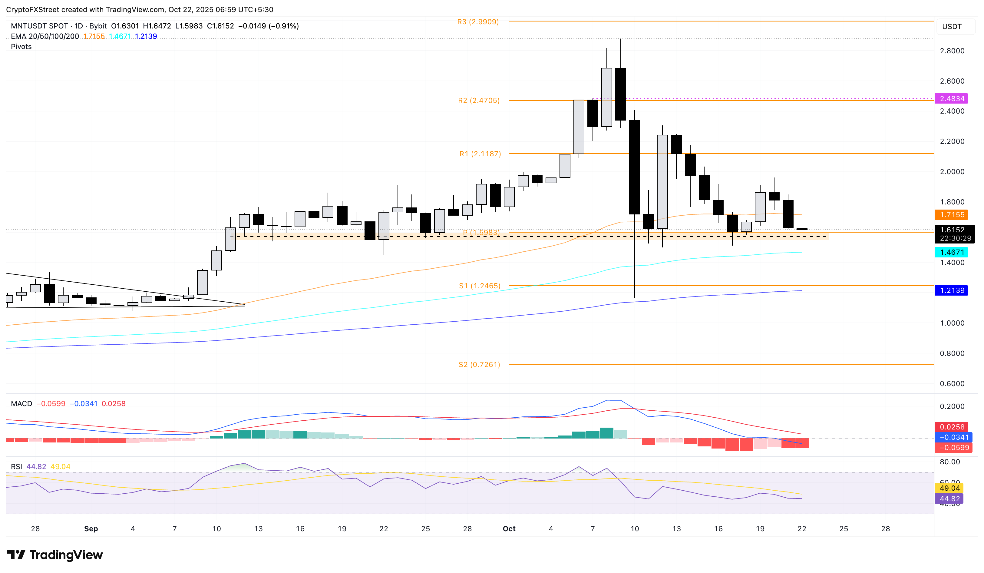 Giá cổ phiếu Mantle giảm nhẹ 1% vào thời điểm viết bài hôm thứ Tư, kéo dài chuỗi giảm ngày thứ ba liên tiếp, tương đương mức giảm 13% trong tuần này . Đợt thoái lui đang diễn ra thử thách vùng hỗ trợ 1,59 đô la, vốn đã chứng kiến nhiều lần đảo chiều vào đầu tháng này, tiềm ẩn nguy cơ sụp đổ.