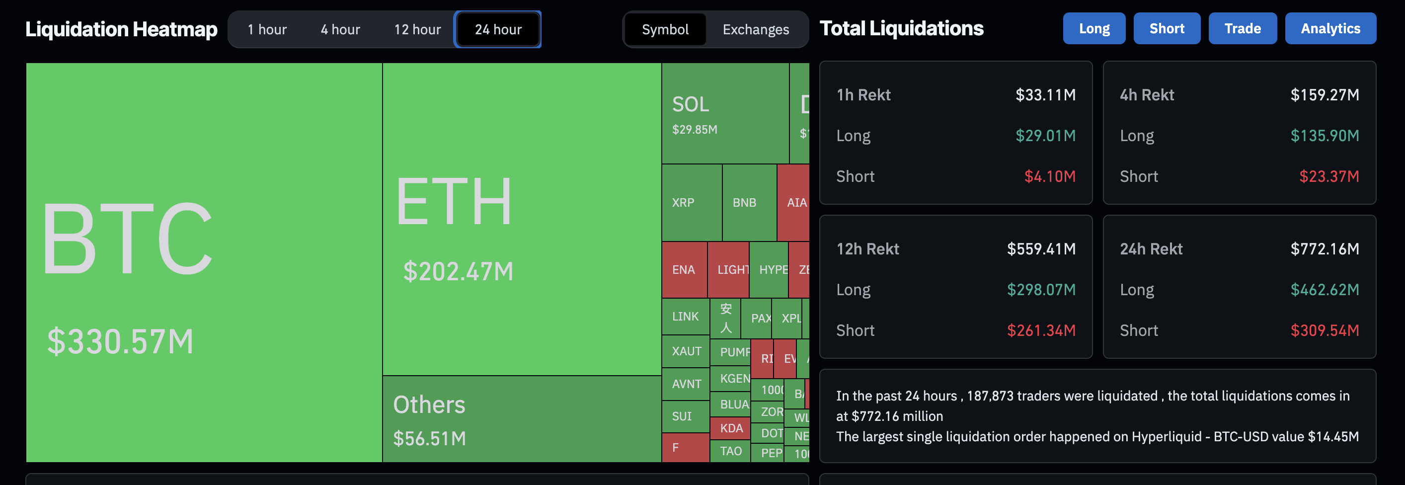 Làn sóng thanh lý tăng vọt, chủ yếu là thanh lý vị thế mua, trên thị trường tiền điện tử nhấn mạnh sự biến động gia tăng và xu hướng giảm giá đang chiếm ưu thế. Dữ liệu của CoinGlass cho thấy 772 triệu đô la giá trị hợp đồng mở đã bị thanh lý bắt buộc trong 24 giờ qua, với 62,62 triệu đô la thanh lý vị thế mua vượt xa 309,54 triệu đô la lỗ thanh lý vị thế bán.
