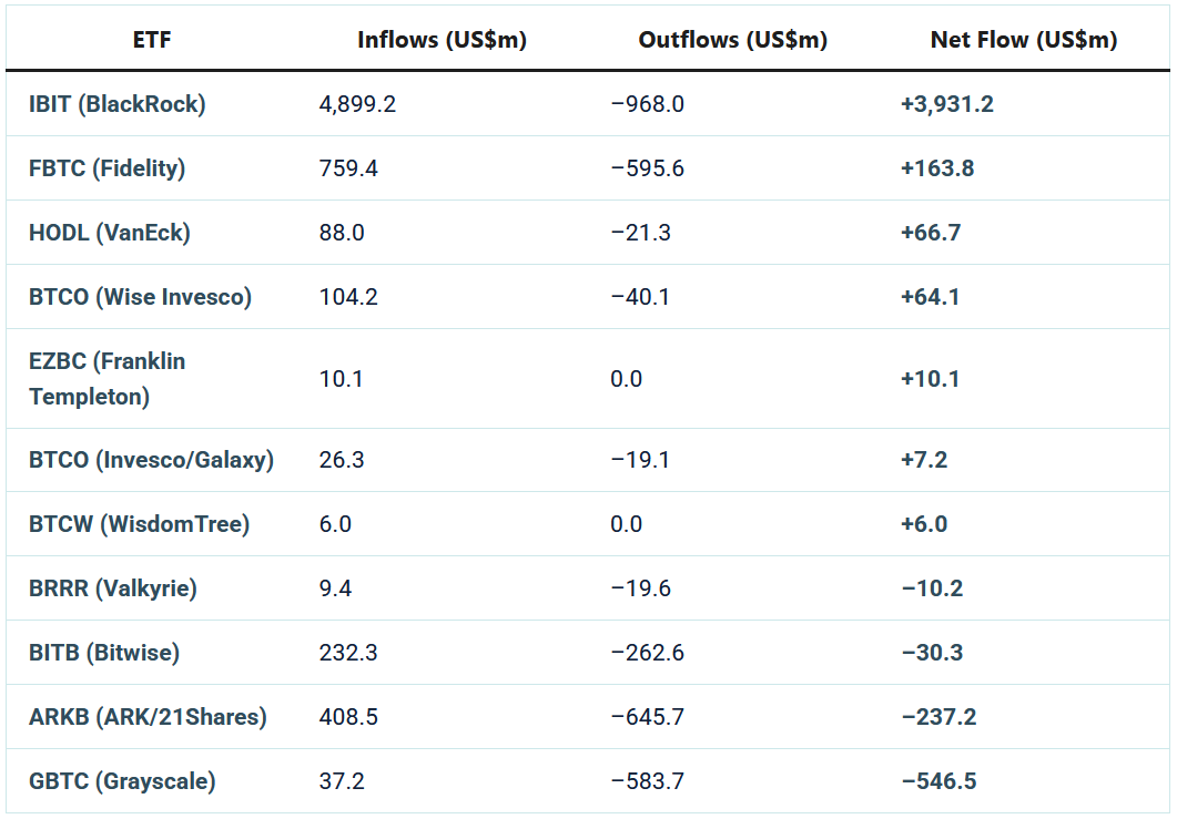 Các quỹ giao dịch trao đổi Bitcoin (BTC) đã phục hồi mạnh mẽ vào tuần cuối cùng của tháng 10, thu hút khoảng 3,43 tỷ đô la dòng vốn ròng, dẫn đầu là 3,93 tỷ đô la của BlackRock và 163,8 triệu đô la của Fidelity .