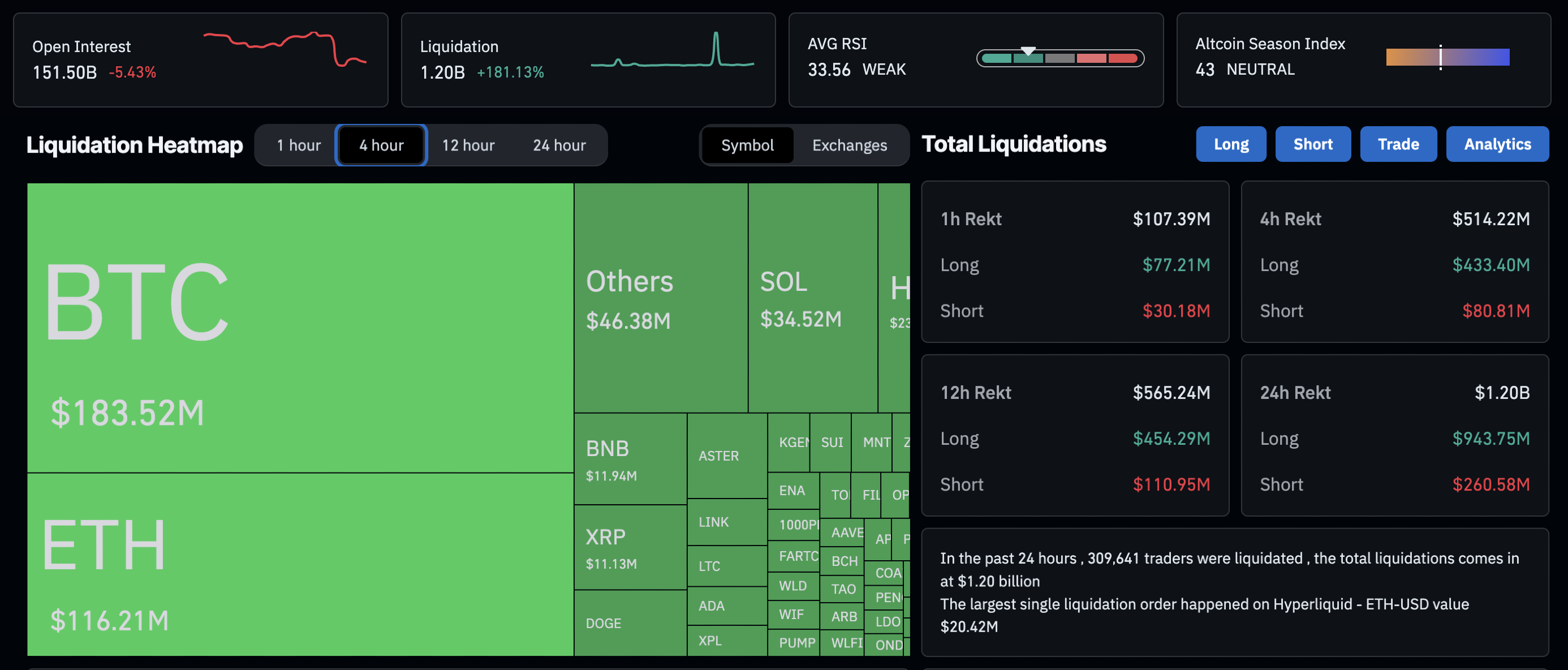 Với việc giá tiền điện tử lao dốc không phanh, thị trường phái sinh chứng kiến sự xóa sổ mạnh mẽ của các vị thế chủ yếu thiên về xu hướng tăng giá. Dữ liệu từ CoinGlass cho thấy tổng số lệnh thanh lý đạt 1,20 tỷ đô la trong 24 giờ qua, với lệnh mua là 943,75 triệu đô la, vượt xa lệnh bán là 260,58 triệu đô la.