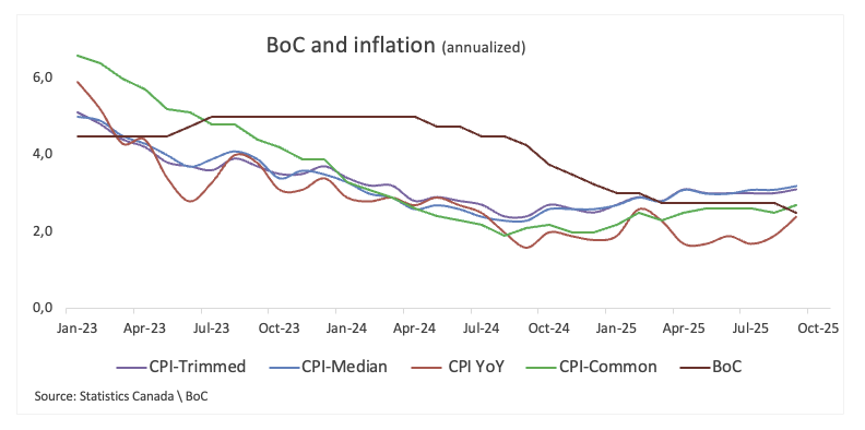 Hồi tháng 9, BoC đã cắt giảm lãi suất 25 điểm cơ bản xuống còn 2,50%, một động thái mà thị trường đã phản ánh đầy đủ. Sau cuộc họp đó, Thống đốc Tiff Macklem đã đưa ra một giọng điệu thận trọng, nói rằng bức tranh lạm phát không thay đổi nhiều trong vài tháng qua. Ông chỉ ra những dữ liệu trái chiều và nhấn mạnh cách tiếp cận theo từng cuộc họp. Mặc dù áp lực lạm phát có vẻ đã được kiềm chế phần nào, ông nhấn mạnh rằng Ngân hàng Trung ương sẵn sàng hành động nếu rủi ro bắt đầu tăng cao.