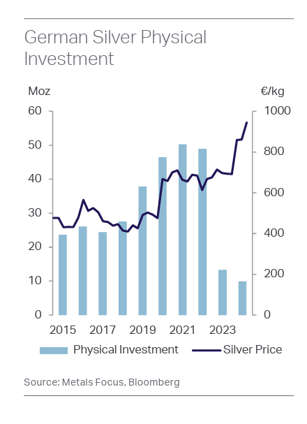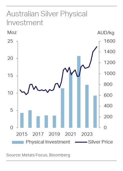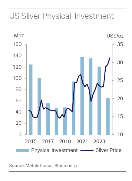 Nhu cầu đã phục hồi nhẹ trong năm nay, một phần là do hoạt động bán ra đã giảm bớt. Metals Focus dự báo nhu cầu đầu tư bạc vật chất sẽ tăng 25% so với cùng kỳ năm trước vào năm 2025.