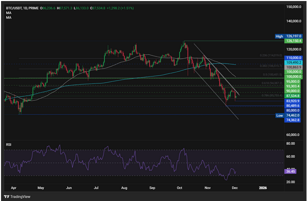 Để kéo dài xu hướng giảm, bên bán sẽ cần phá vỡ một cách thuyết phục xuống dưới 85.000 để kiểm tra mức 80.000. Việc phá vỡ dưới mức thấp nhất trong 7 tháng sẽ mở ra cánh cửa đến mức 74.400, mức thấp nhất trong năm 2025.