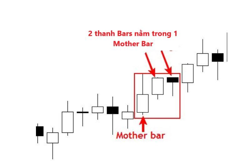 - 1 hoặc nhiều cây nến phía sau có đỉnh thấp hơn và đáy cao hơn nến mẹ, gọi là Inside Bar, được viết tắt là nến “ib” (hay nói cách khác, mức High và Low của Inside Bar phải nằm trọn trong Mother Bar).