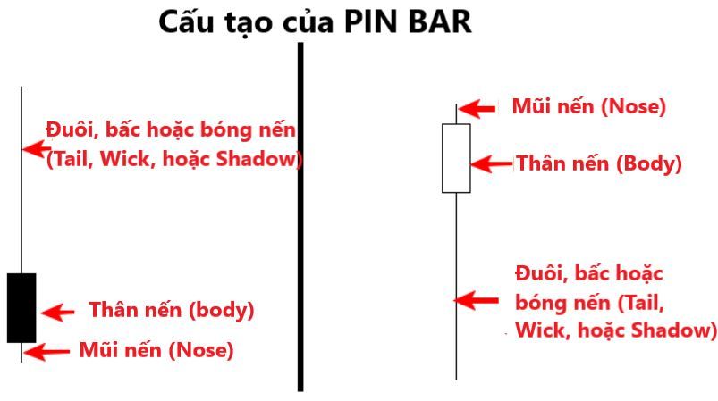 Pin bar bản thân nó là cây nến với một cái Đuôi (tail), tim (wick) hay Bóng (shadow) dài về phía trên hoặc phía dưới và một thân nến (body) nhỏ hơn rất nhiều, anh em có thể tìm thấy Pin Bar ở bất kỳ biểu đồ Bar hay Candlestick (nến) nào.