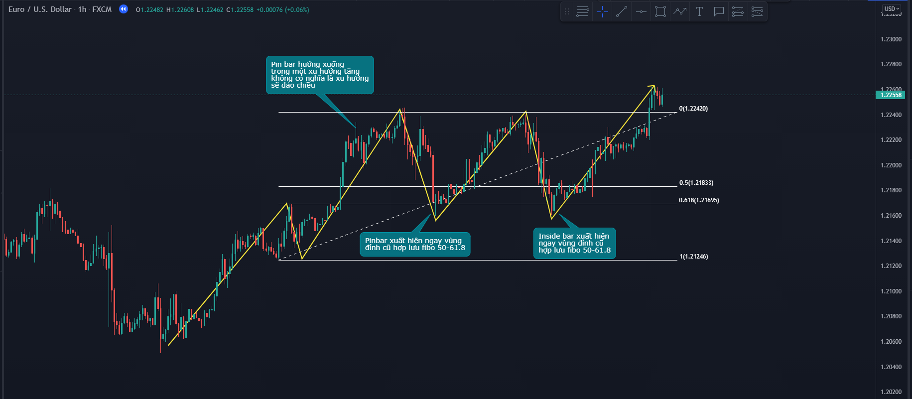Bản chất thật sự của Pin bar là sự phá vỡ cấu trúc ở khung thời gian nhỏ hơn thể hiện ở phần đuôi nến. Anh em hãy xem ví dụ dưới đây để hiểu rõ hơn. Trong biểu đồ dưới đây anh em hãy chú ý cây Pin bar xuất hiện khi chạm vùng fibo 50-61.8 với đuôi nến khá dài. Vậy cấu trúc bị phá vỡ ở đâu? Anh em hãy soi vào khung thời gian nhỏ hơn để thấy rõ. Trong khung nhỏ hơn hơn anh em sẽ thấy rõ ràng đuôi nến ở khung lớn chính là những cây nến giảm mạnh ở khung nhỏ và khi cây pin bar ở khung lớn đóng cũng chính là lúc cấu trúc tăng ở khung thời gian nhỏ bị đảo chiều. Đó là lí do vì sao Pin bar là dấu hiệu của sự đảo chiều anh em cần hiểu rõ bản chất chứ không nên máy móc nhé.