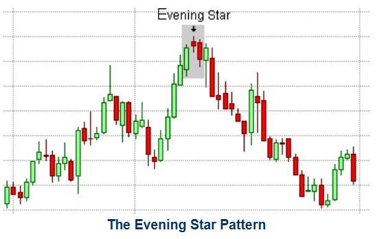 Ngôi sao buổi tối là một mô hình đỉnh đảo ngược xu hướng giảm giá, cảnh báo về sự đảo ngược tiềm năng của một xu hướng tăng. Nó trái ngược hướng với sao buổi sáng. Nhưng giống như ngôi sao buổi sáng, bao gồm ba chân nến, với chân nến ở giữa là một ngôi sao. Nến đầu tiên trong ngôi sao buổi tối phải có màu xanh và phải có thân thật tương đối lớn. Nến thứ hai là ngôi sao, đó là một cây nến với phần thật ngắn không chạm vào phần thân thật của nến trước đó. Ngôi sao cũng có thể hình thành trong bóng trên của nến đầu tiên. Ngôi sao là dấu hiệu đầu tiên của sự yếu kém vì nó chỉ ra rằng những người mua không thể đẩy giá lên cao hơn nhiều so với mức đóng cửa của giai đoạn trước. Điểm yếu này được xác nhận bởi nến thứ 3 màu đỏ theo sau ngôi sao.