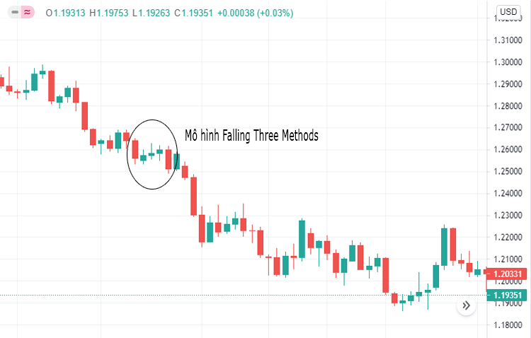 Là mô hình ngược lại so với mô hình Rising Three Methods, Falling Three Methods xuất hiện trong một xu hướng giảm và báo hiệu rằng giá sẽ còn tiếp tục giảm.