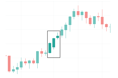 Trong một xu hướng tăng giá, sự xuất hiện của các cây nến xanh liên tiếp thể hiện rằng lực mua vẫn còn tiếp diễn, do đó có thể giá sẽ tiếp tục tăng cao hơn.