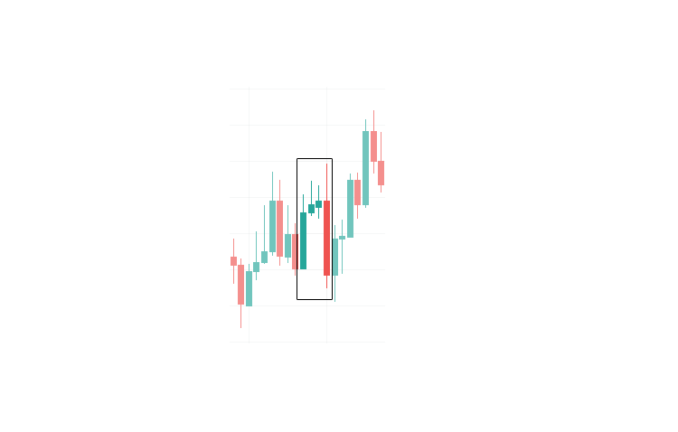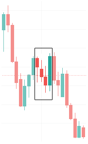 - 3 đến 4 cây nến ở giữa là các cây nến tăng nhẹ với thân nến ngắn và nằm gọn trong thân của cây nến đầu tiên.
