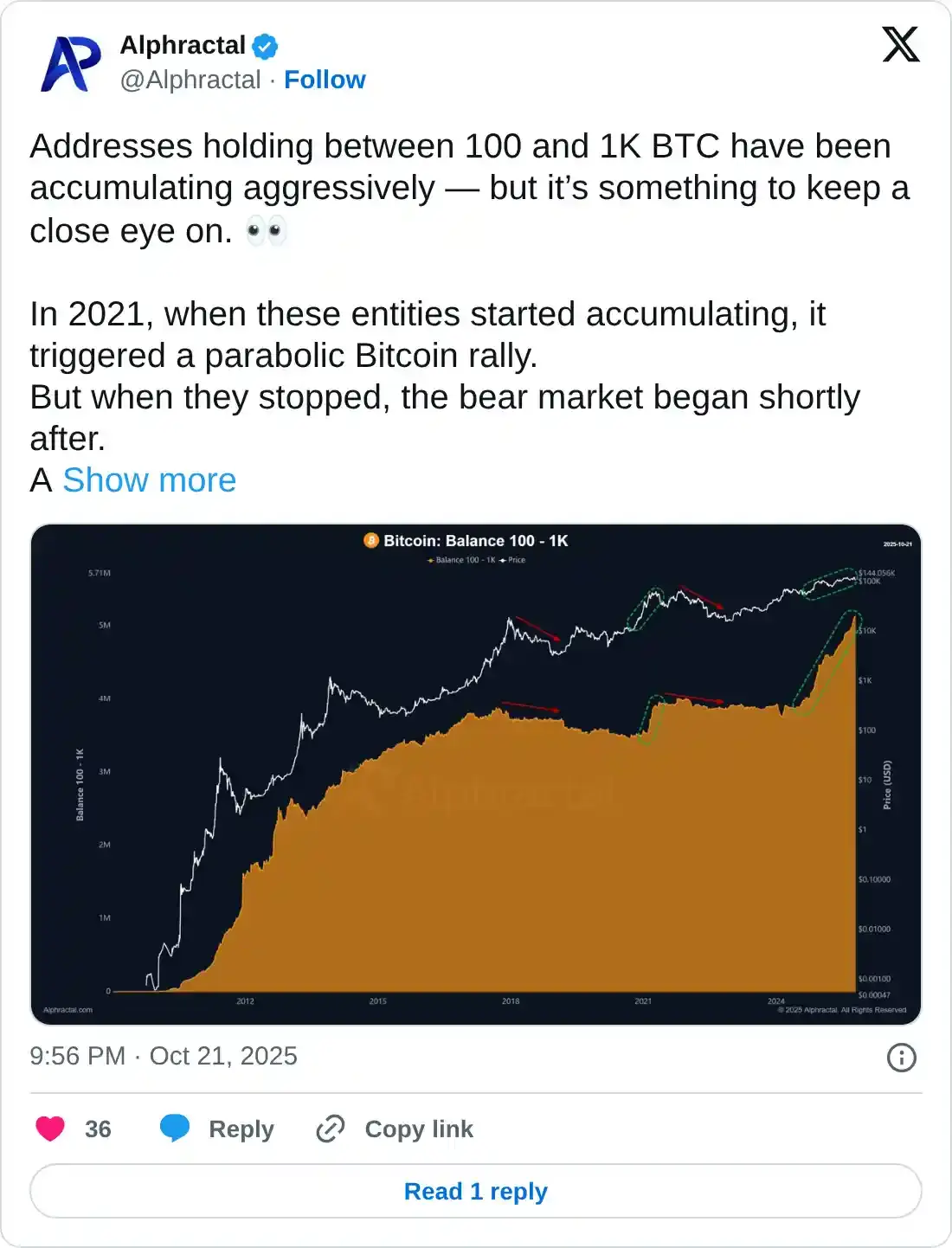 Alphractal, một nền tảng phân tích dữ liệu tiền điện tử, đã chia sẻ một làn sóng mua vào liên tục giữa các nhà đầu tư với khối lượng từ 100 đến 1.000 BTC từ đầu năm 2024. Một làn sóng mua tương tự cũng đã được quan sát thấy trong nhóm nhà giao dịch này trước đợt tăng giá năm 2021. Tuy nhiên, việc dừng lại trong xu hướng mua của họ trùng khớp với đỉnh điểm của chu kỳ 2017 và 2022.