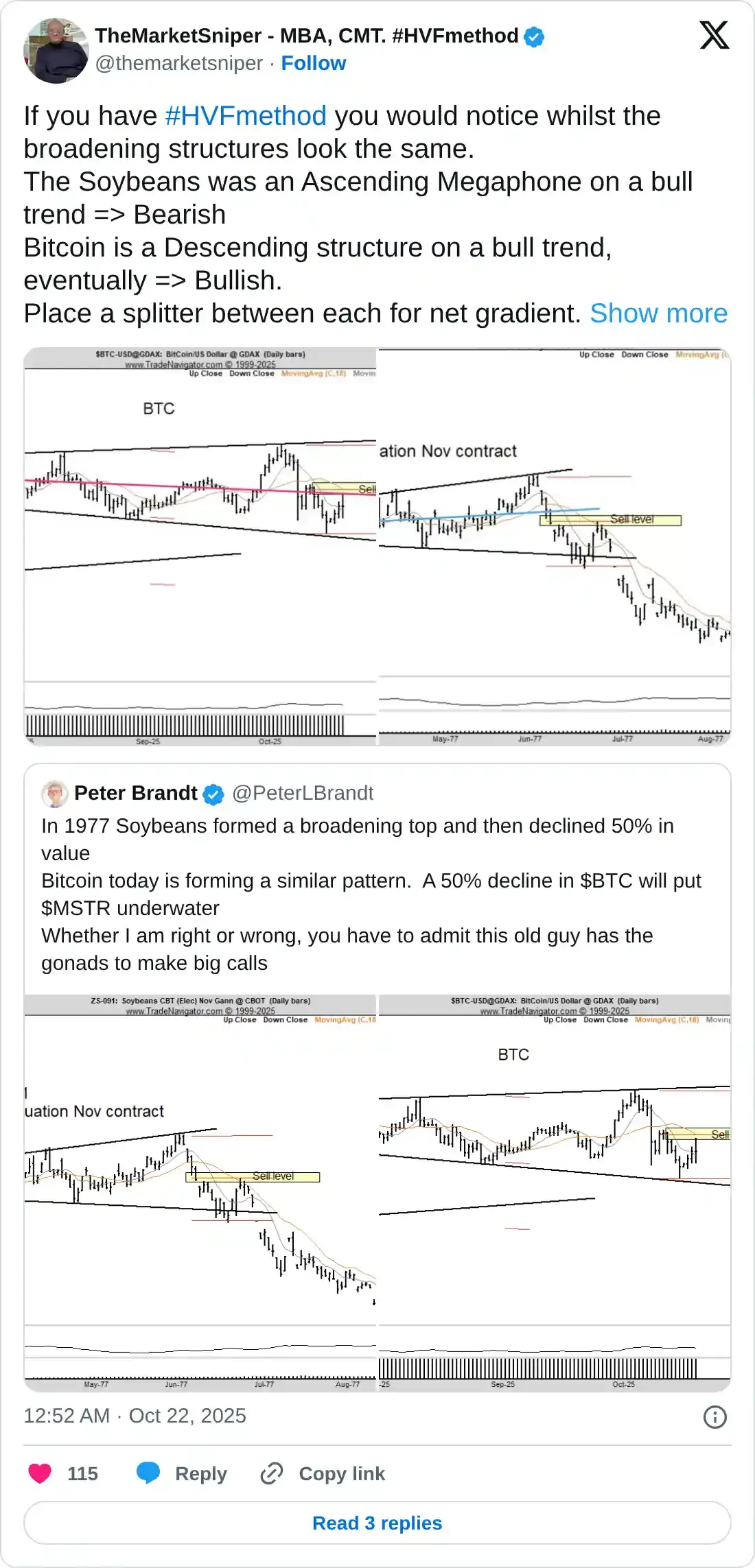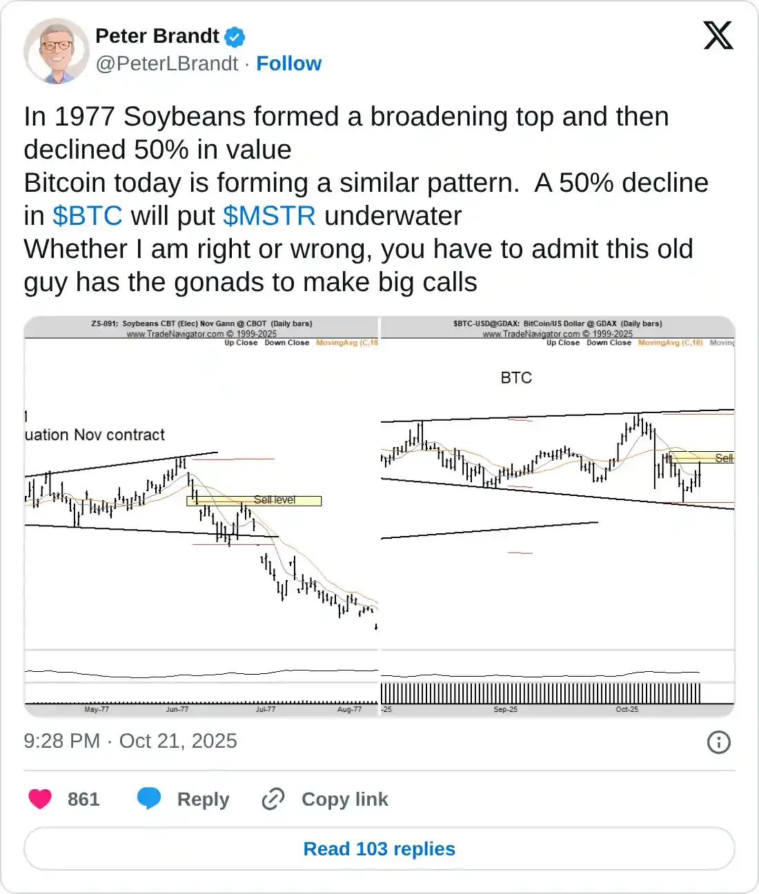 Brandt so sánh đỉnh mở rộng của Bitcoin với xu hướng tương tự từng thấy ở Soybean, trước cú sụp đổ năm 1977, dẫn đến mức giảm 50%. Nhà phân tích cũng chia sẻ cảnh báo tương tự về mức giảm 50% của BTC, có thể vượt quá giá mua trung bình của lượng Bitcoin mà Microstrategy (MSTR) nắm giữ.