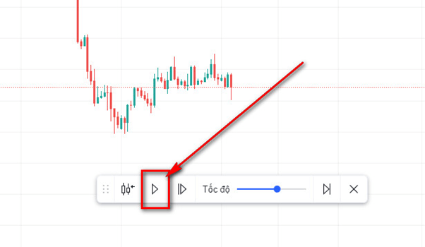 Anh em nhấn nút Play hình tam giác để biểu đồ tự động di chuyển và bắt đầu thực hiện backtest. Nếu nhấn nút Play hình tam giác có thêm một đường thẳng dọc bên cạnh, thì giá sẽ chạy từng cây nến một với mỗi lần click. Anh em cũng có thể điều chỉnh tốc độ phát lại với thanh kéo màu xanh kế bên.