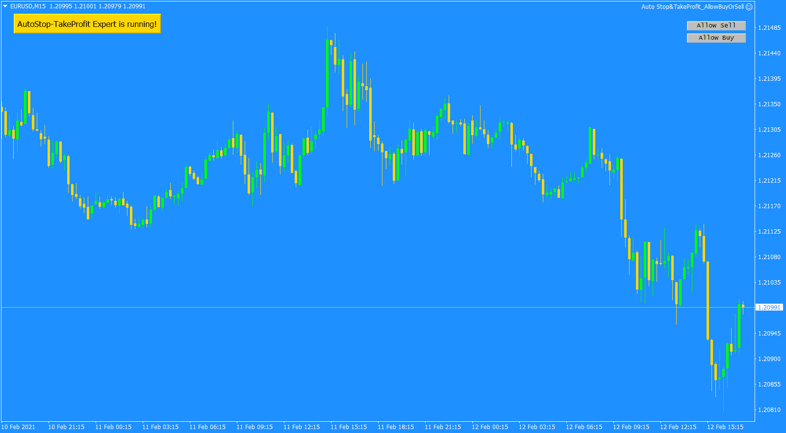 Khi Auto Stop và TakeProfit Expert Advisor lần đầu được thả trên biểu đồ giao dịch, nó sẽ tạo một nút ở phần trên bên trái của biểu đồ chính có chứa dòng chữ khá lớn “AutoStop-TakeProfit Expert đang chạy” và được làm nổi bật bởi một nền đầy màu sắc để thu hút sự chú ý của người dùng khi họ ghé qua để xem biểu đồ này. Bằng cách này, người dùng nhận biết được sự hiện diện của nó và có thể sử dụng nó ngay lập tức.