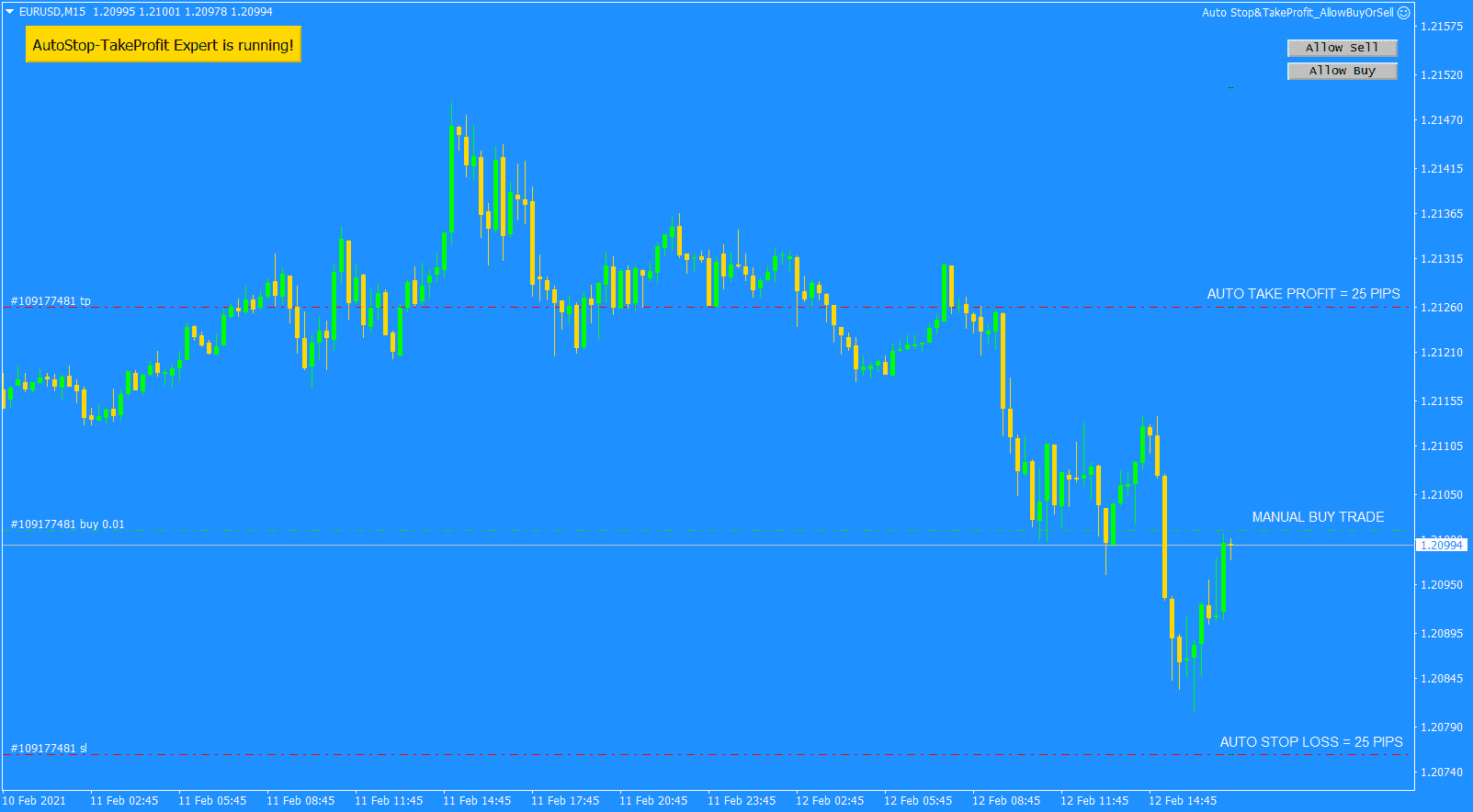 EA tự đặt Stop loss và Take profit sẽ tự động xuất hiện ngay khi bạn bắt đầu giao dịch và bạn không cần phải lo lắng về việc cắt lỗ và chốt lời bởi vị Chuyên gia Cố vấn này sẽ giải quyết giúp bạn.