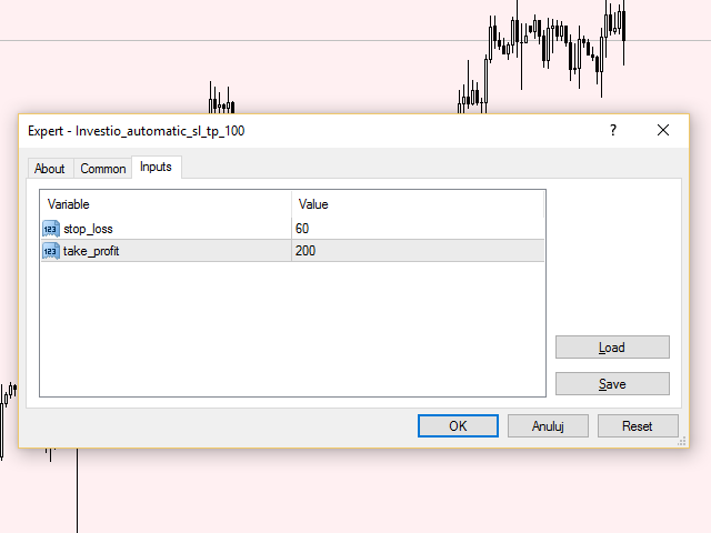 Chỉ có 3 biến trong Inputs mà người dùng có thể điền thông tin vào. Ngoài lệnh Stop loss và Take profit, các biến số có sẵn khác rất dễ hiểu và dễ sử dụng. Các biến này và giá trị mặc định của chúng được giải thích bên dưới: