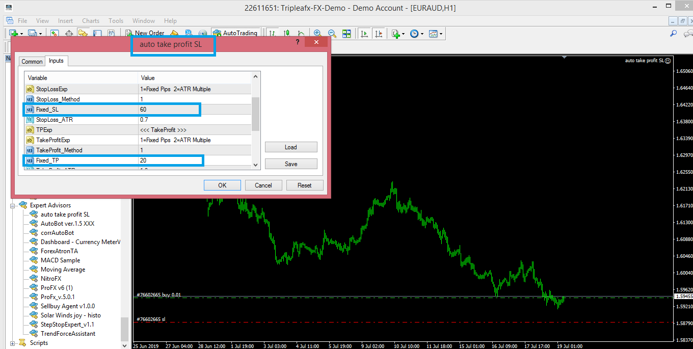 - Khởi động lại nền tảng MT4> Mở công cụ Điều hướng> Expert> Chọn Auto Takeprofit- Stoploss> Chèn EA vào biểu đồ. Cho phép giao dịch live account & Cho phép nhập DLL.