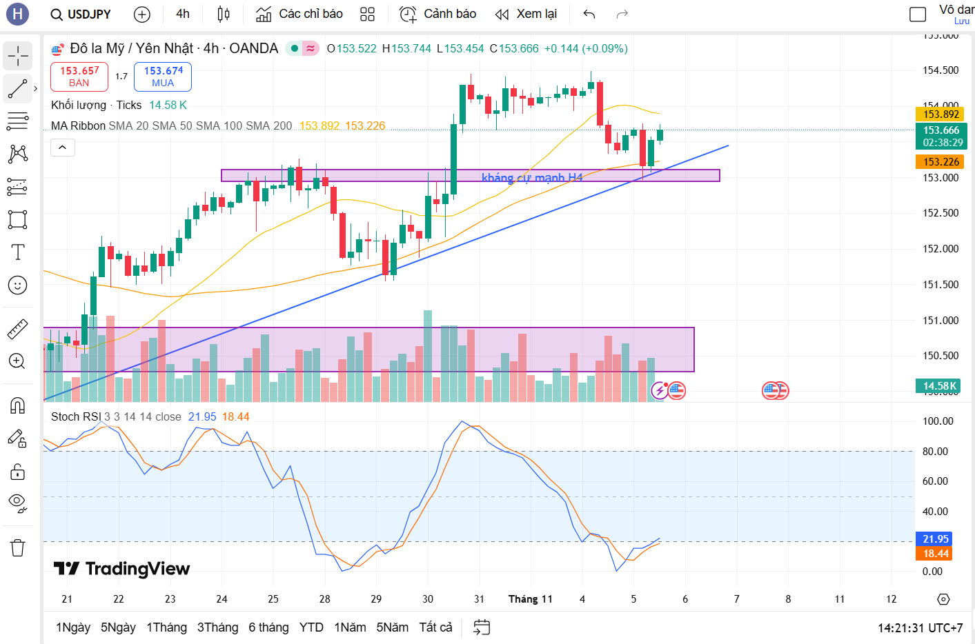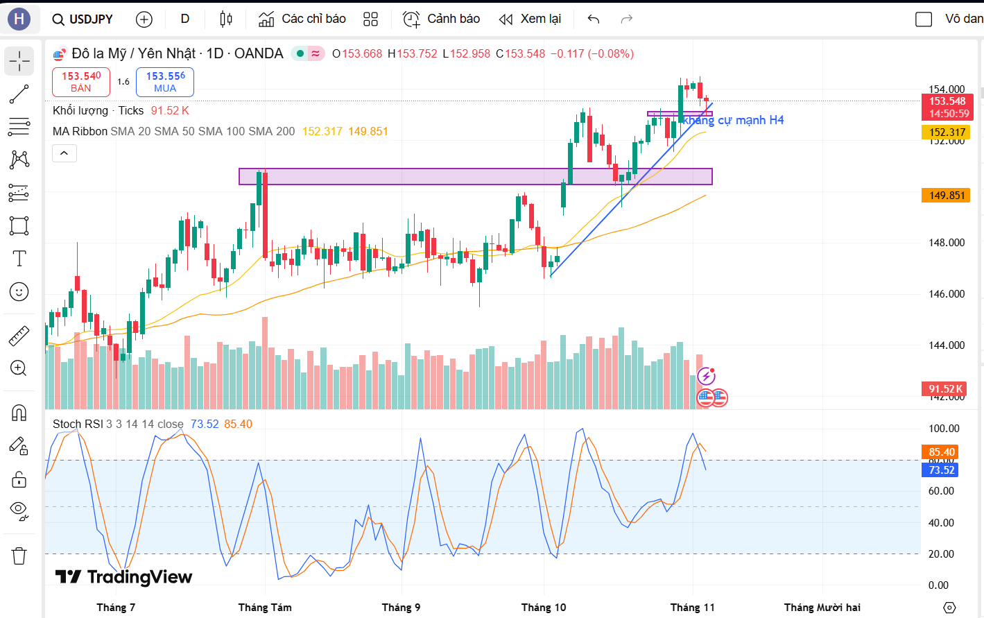 Ở khung giá H4 quen thuộc dành cho những nhà đầu tư có tỉ lệ quay vòng vốn thấp, chỉ số USDJPY vẫn ở trên vùng kháng cự H4. Tuy những cây nền trong ngày 4/11 đã chạm gần với đường trung bình động ngắn hạn (MA20), chỉ số RSI Stoch đã thoát khỏi quá bán là một tín hiệu tốt cho những cây nến xanh trong ngày hôm nay.