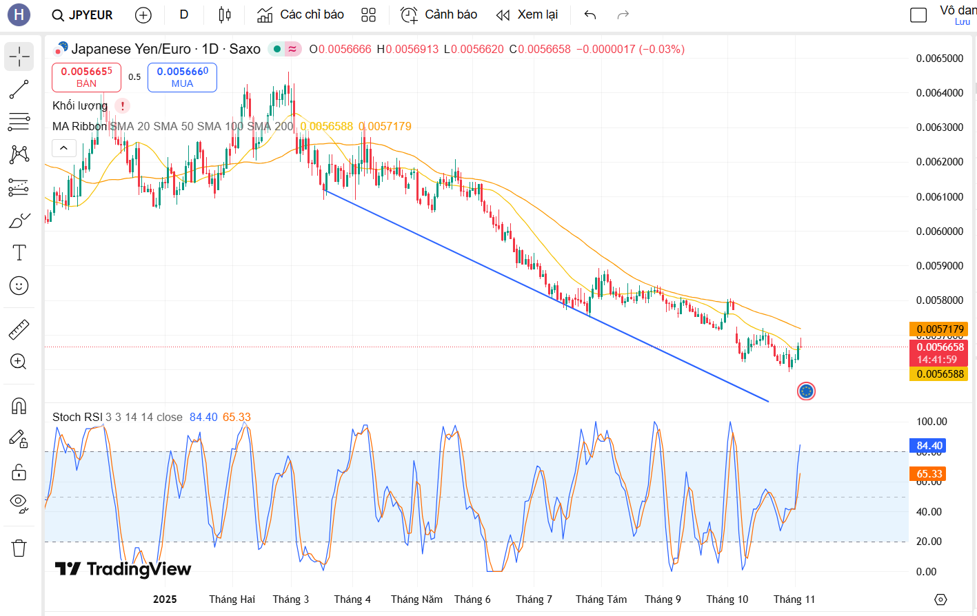Hiện tượng này không chỉ xuất phát từ đà tăng dài trưởng trung hạn của đồng USD mà còn tự suy yếu đáng kể của đồng Yên Nhật. Khi so sánh sức mạnh với một đồng tiền chính khác như EUR, loại tiền tệ này đã cho thấy sự suy yếu rõ rệt kéo dài từ tháng 3 năm 2025. Những chỉ báo kĩ thuật cho thấy xu hướng này sẽ không dừng lại ít nhất là trong ngắn hạn