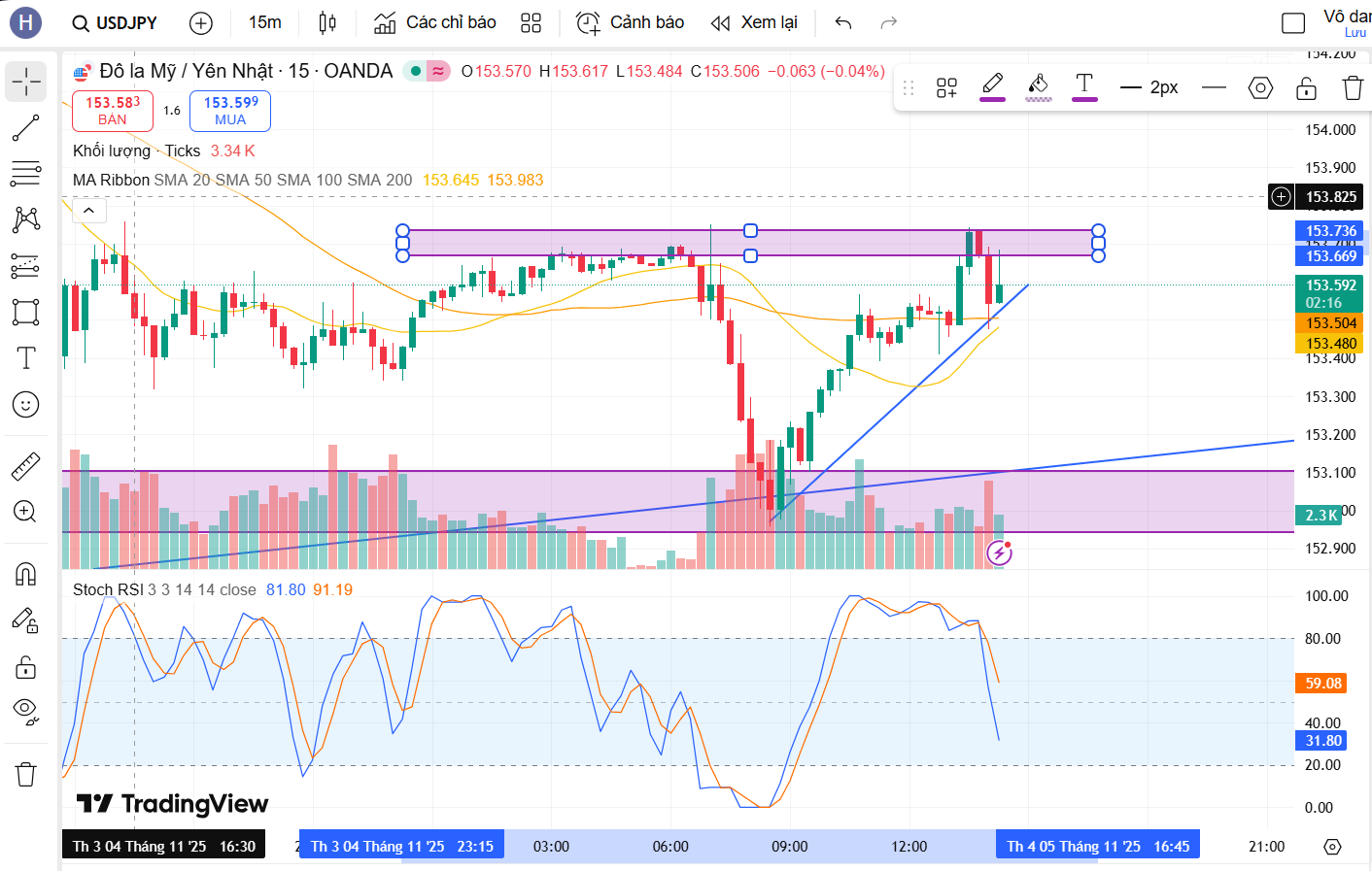 Ở những khung giá nhỏ hơn ví dụ như m15, chỉ số đã tiếp vùng vùng cản 153.67-153.73 mặc dù xu hướng đi lên vẫn chưa quá rõ ràng ở thời điểm 2:30 chiều. Nếu như vùng cản trên bị phá vỡ, những điểm entry tiềm năng sẽ mở ra cho những nhà đầu tư theo chiều mua