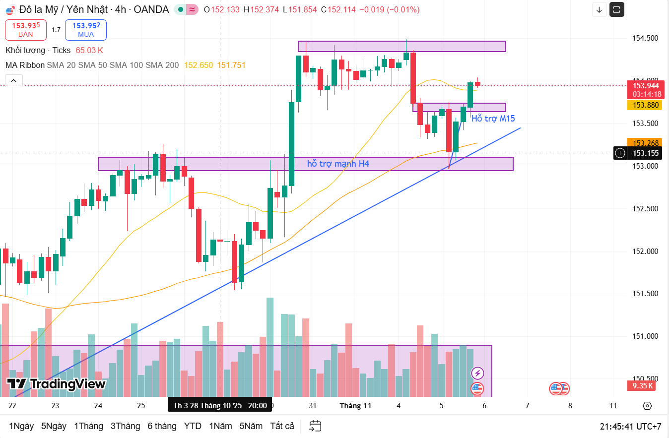 Ở khung giá H4 quen thuộc dành cho những nhà đầu tư có tỉ lệ quay vòng vốn thấp, chỉ số USDJPY vẫn ở trên vùng hỗ trợ H4. Tuy những cây nền trong ngày 4/11 đã chạm gần với đường trung bình động ngắn hạn (MA20), chỉ số RSI Stoch đã thoát khỏi quá bán là một tín hiệu tốt cho những cây nến xanh trong ngày hôm nay.