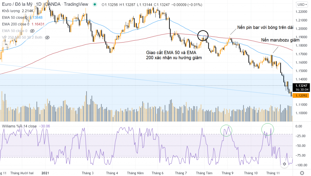 Xem xét biểu đồ giá của EURUSD khung D1 cho ví dụ giao dịch theo xu hướng với chỉ báo Williams % R: Trên biểu đồ sau khi EMA 50 cắt xuống EMA 200 thì các lần giá tiệm cận với các đường EMA, chỉ báo cho tín hiệu quá mua và giá cho các mẫu hình nến đảo chiều giảm. Từ đây anh em có thể mở 2 vị thế bán theo xu hướng thành công.
