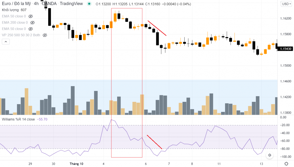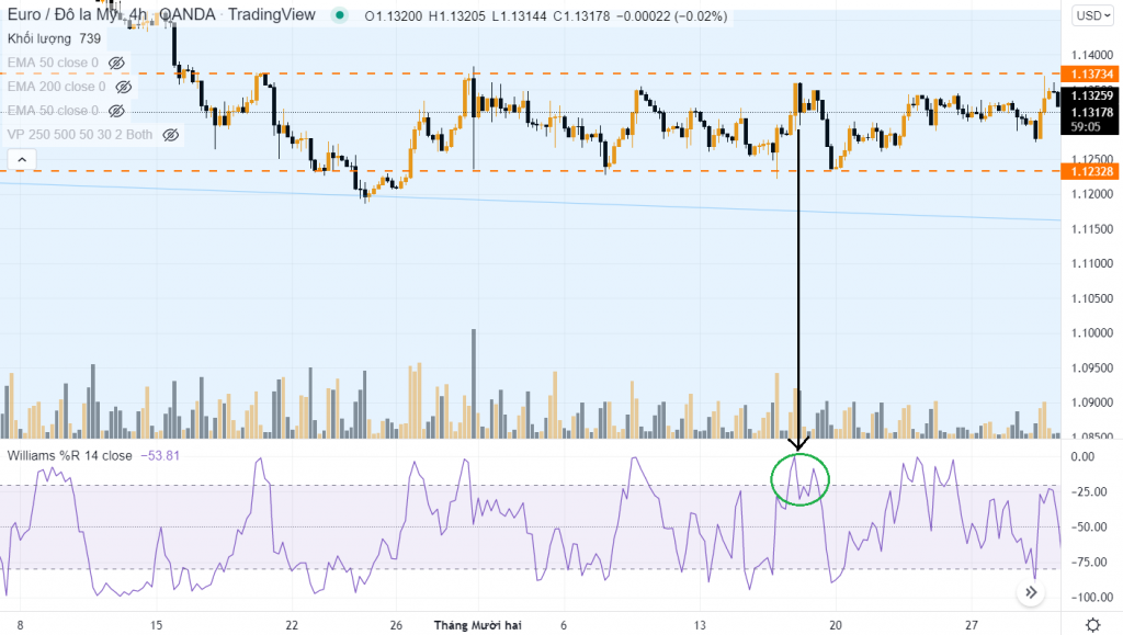 Như ví dụ dưới đây: Sau khi giá có một nhịp giảm, anh em có thể thấy chỉ báo Williams % R hiện ở mức trung bình, sau đó tiếp theo giá tiếp tục giảm thêm một nhịp nữa và chỉ báo về vùng dưới -20 lúc này cho thấy động lực đã yếu và sau đó kết quả giá đi ngang trong khung giá.