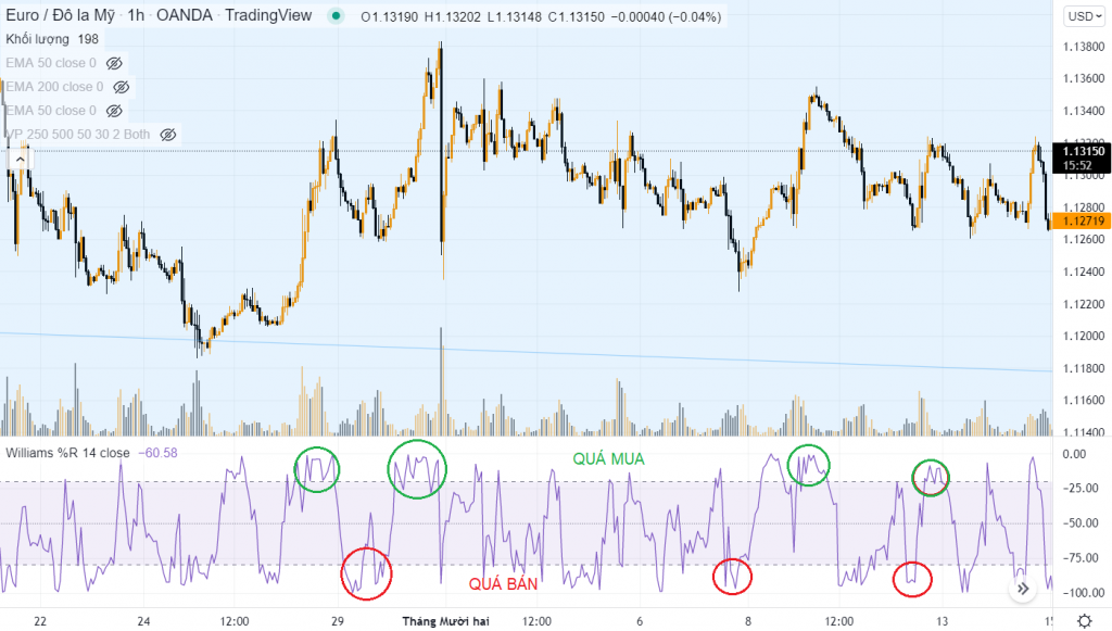 Hãy nhìn biểu đồ bên dưới, banh em sẽ thấy cách mà chỉ báo Williams % R xác định các khu vực quá mua và quá bán đơn giản như thế nào – rất giống và tương tự như các chỉ báo dao động khác như RSI hay Stochastic,…