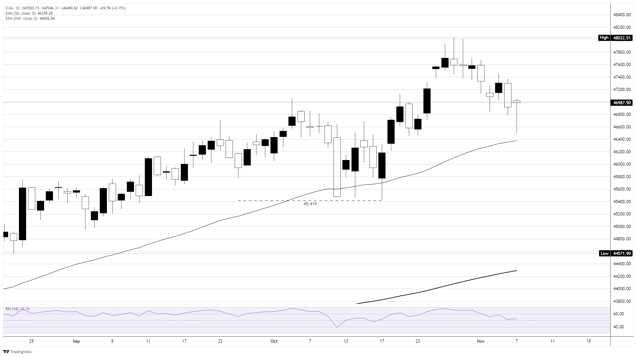 Chỉ số Dow Jones Industrial Average (DJIA) tiếp tục giảm điểm vào thứ Sáu, lần đầu tiên kiểm tra dưới mức 46.800 điểm sau gần ba tuần trước khi gần như quay trở lại mức cân bằng trong ngày do đà giảm của cổ phiếu AI và kết quả khảo sát người tiêu dùng ảm đạm đã kéo cả hai vế của phương trình đầu tư-tiêu dùng đi xuống. Thứ Sáu đáng lẽ đã chứng kiến việc công bố báo cáo việc làm Phi nông nghiệp (NFP) mới nhất của Hoa Kỳ, nhưng việc chính phủ Hoa Kỳ đóng cửa, chính thức là đợt đóng cửa dài nhất trong lịch sử Hoa Kỳ, đang làm hạn chế dòng dữ liệu chính thức, khiến các nhà đầu tư phải vật lộn với dữ liệu tư nhân biến động, và đặt ra những dấu hỏi lớn về việc liệu các số liệu lạm phát và việc làm quan trọng sẽ ra sao.