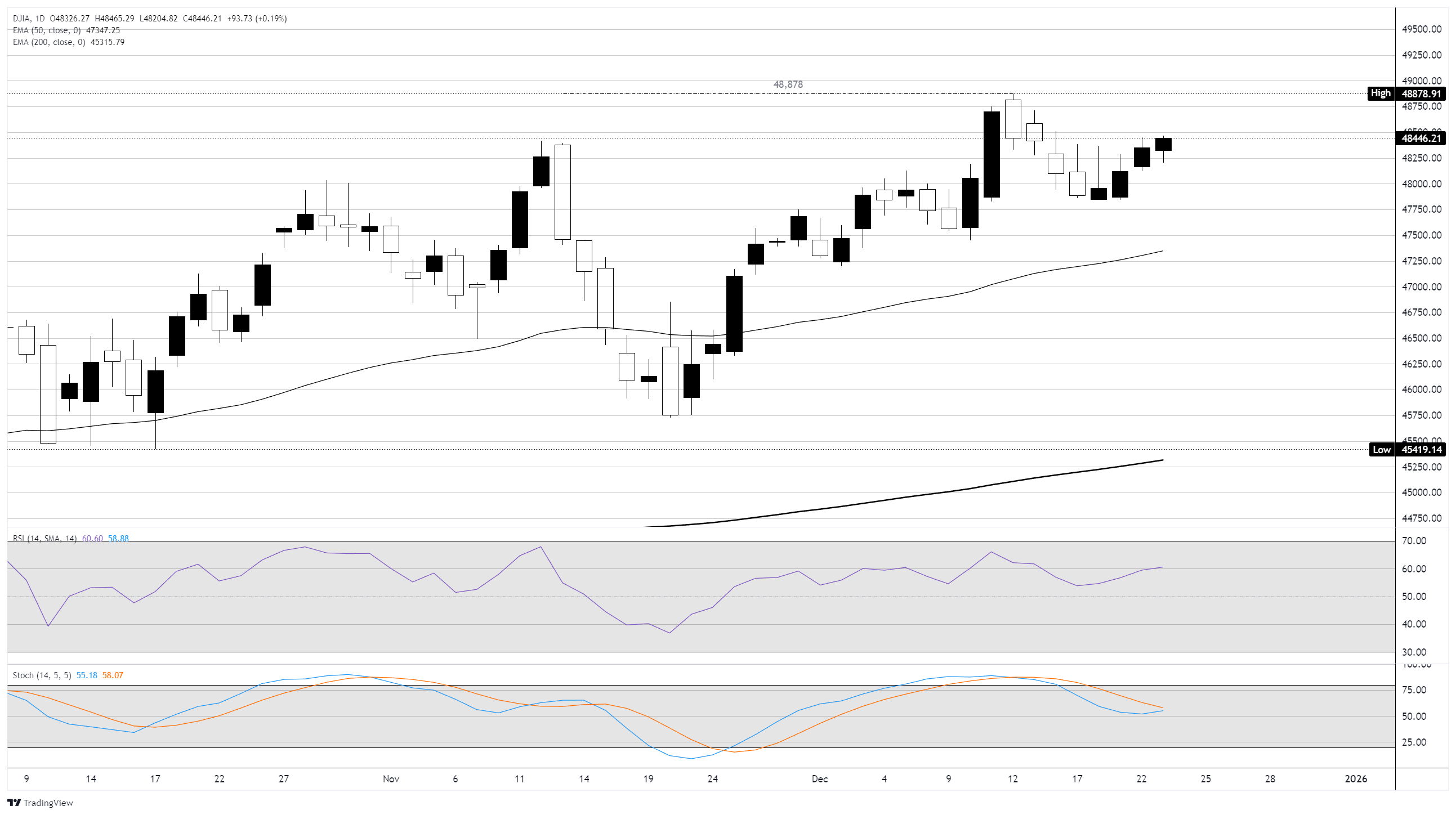 Do thị trường chứng khoán Mỹ dự kiến đóng cửa sớm vào đêm Giáng sinh và vẫn đóng cửa vào ngày Giáng sinh, các nhà đầu tư đang bước vào kỳ nghỉ lễ với thị trường chứng khoán ở gần mức kỷ lục, được hỗ trợ bởi sự lạc quan về vị thế dẫn đầu của ngành công nghệ, nền kinh tế kiên cường và triển vọng về chính sách tiền tệ nới lỏng hơn trong tương lai.