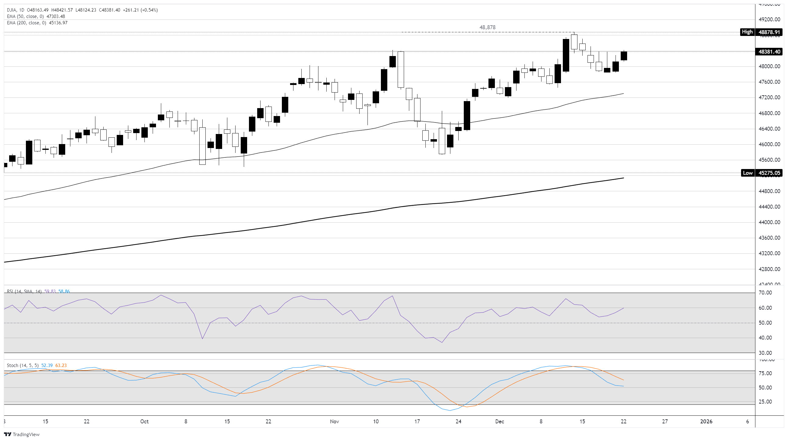 Chỉ số Dow Jones Industrial Average (DJIA) tăng điểm vào thứ Hai, bước vào kỳ nghỉ lễ Giáng sinh với tinh thần lạc quan khi thị trường chứng khoán chuyển sang xu hướng tăng giá để kết thúc năm giao dịch. Cổ phiếu liên quan đến lĩnh vực trí tuệ nhân tạo (AI) tăng điểm, với sự đóng góp mạnh mẽ từ cả lĩnh vực tài chính và vật liệu.