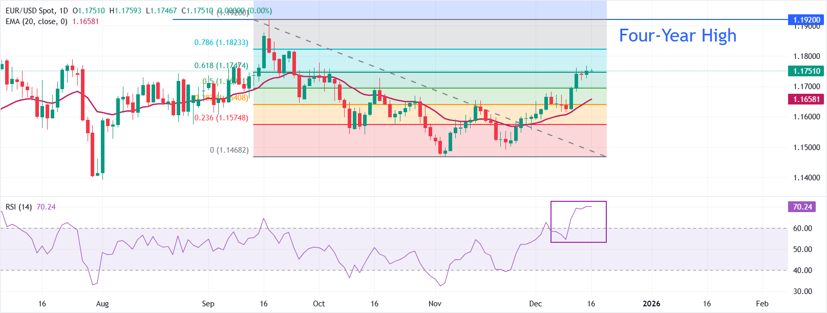 Tính đến thời điểm viết bài, tỷ giá EUR/USD đang giao dịch đi ngang quanh mức 1.1750 trước khi công bố dữ liệu PMI của Đức/khu vực Euro. Đường trung bình động hàm mũ 20 ngày (EMA) ở mức 1.1658 đang dốc lên và duy trì dưới mức giá hiện tại, giữ vững xu hướng tăng trong ngắn hạn và tạo ra mức hỗ trợ ban đầu. Nếu giữ vững trên đường EMA 20 ngày, đà tăng giá sẽ được duy trì.