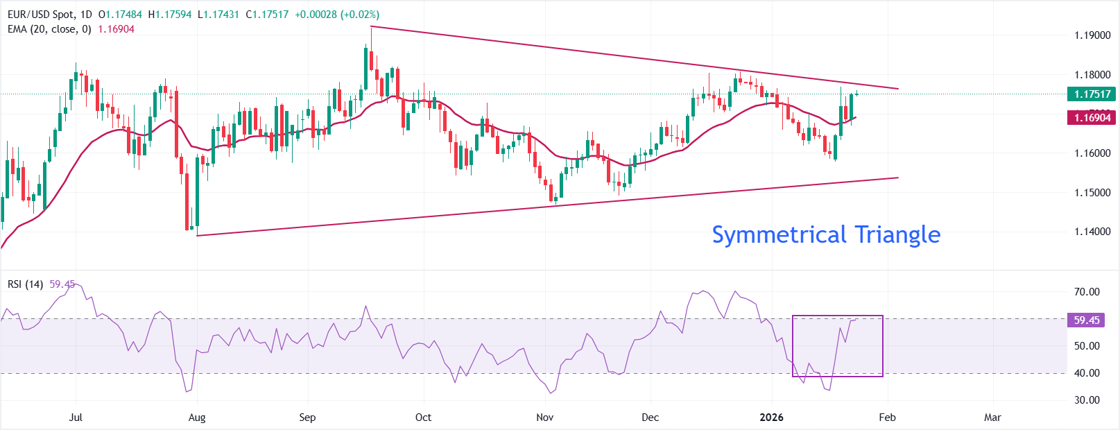 Đường trung bình động lũy thừa (EMA) 20 ngày ở mức 1.1690 đang chuyển hướng lên cao hơn, và giá giữ vững trên mức này, duy trì đà phục hồi ngắn hạn. Việc đóng cửa trên đường EMA 20 ngày sẽ củng cố xu hướng tăng giá. Chỉ số sức mạnh tương đối (RSI) 14 ngày ở mức 59.44 báo hiệu đà tăng mạnh.