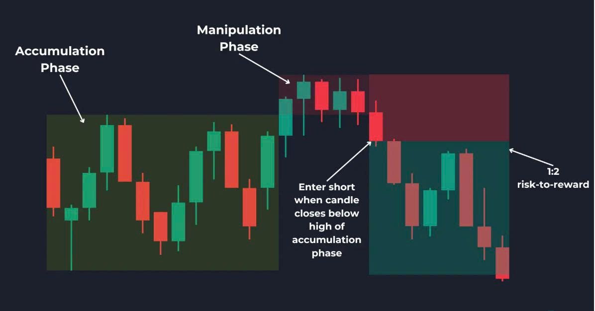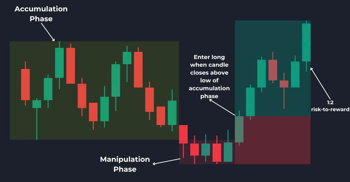 Bạn nên vào lệnh mua/bán sau giai đoạn thao túng. Khi giá đóng cửa trên hoặc dưới mức cao/thấp của giai đoạn tích lũy, bạn có thể vào lệnh.