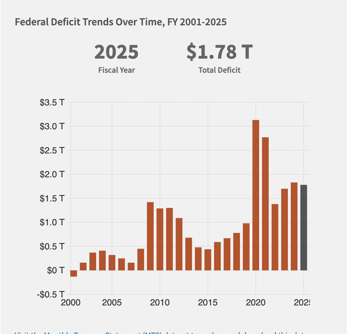 Tuy nhiên, nhờ nguồn thu thuế quan dồi dào, thâm hụt ngân sách năm tài chính 2025 đã giảm đi một chút – nếu bạn có thể gọi mức thâm hụt 1,78 nghìn tỷ đô la là “nhỏ”.