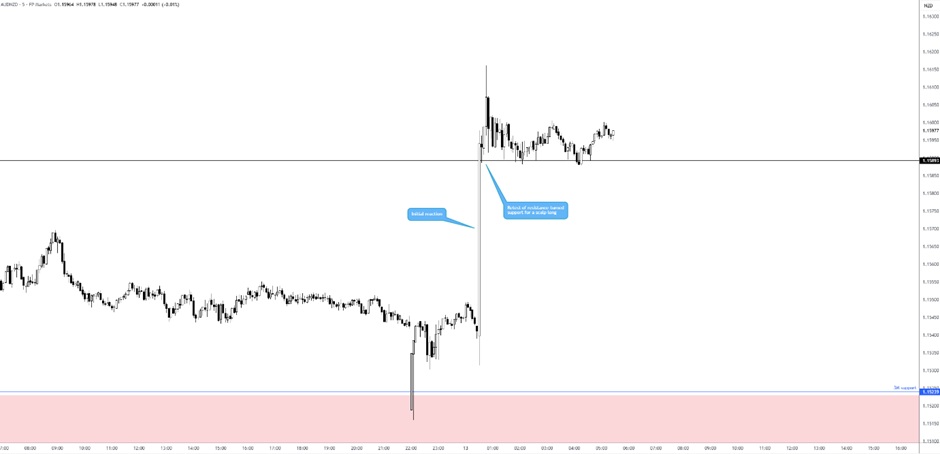 Tuy nhiên, tôi muốn tập trung vào đồng AUD, đồng tiền vẫn duy trì mức cao hơn so với các đồng tiền G10 khác sau báo cáo việc làm tháng 10 của Úc bất ngờ tăng trưởng. Việc làm tăng 42.200, vượt xa mức dự báo 20.000, trong khi tỷ lệ thất nghiệp ở mức 4,3%, giảm so với mức dự kiến 4,5% của tháng 9. Cặp tỷ giá AUD/NZD (xem bên dưới) đã tạo ra một cơ hội đầu cơ ngắn hạn để tham gia mua vào sau sự kiện trên biểu đồ M5; bạn có thể nhớ rằng tôi đã lưu ý thị trường này cần theo dõi chặt chẽ trong dữ liệu sự kiện được công bố ở mức ước tính tối đa/tối thiểu, và đúng là như vậy.