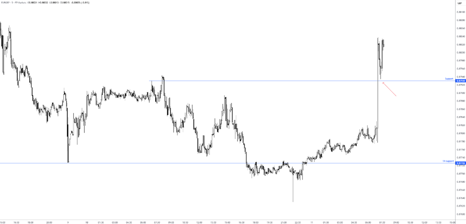 Với tỷ lệ thất nghiệp tăng cao, số lượng nhân viên hưởng lương giảm, và số lượng việc làm trống giảm - giảm 9.000 xuống còn 717.000 - những điều này có thể đủ để giúp BoE chốt hạ lãi suất vào tháng tới. Ngay sau báo cáo việc làm, đồng GBP đã giảm so với các đồng tiền chủ chốt trong nhóm G10, hiện giảm 0,3% so với USD và EUR. Tôi đã theo dõi sát sao ngưỡng hỗ trợ M5 quanh mức 0,8793 bảng Anh trên cặp tỷ giá EUR/GBP (xem bên dưới), nhưng như bạn có thể thấy, nó đã suýt kiểm tra lại ngưỡng này trước khi tiếp tục tăng. Các ngưỡng IQM này thường mang lại cơ hội giao dịch dựa trên sự kiện rủi ro có xác suất cao.