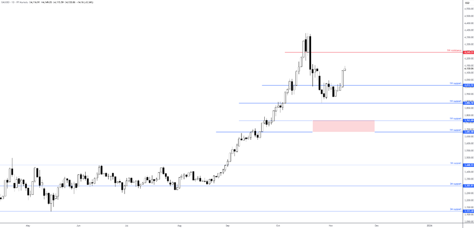 Phải thừa nhận rằng, đà tăng của Vàng đã làm tôi bất ngờ hôm qua, tăng gần 3,0%; Cổ phiếu và USD đều tăng giá, đúng như dự đoán. Quan điểm thông thường cho rằng kim loại quý này có thể giảm giá sau những tin tức như vậy. Xu hướng tăng giá của Vàng chắc chắn vẫn đang vững chắc , với các nhà giao dịch theo đà tăng giá có thể sẽ chốt lời trên mức 4.000 USD. Như thể hiện trên biểu đồ hàng ngày bên dưới, ngoài ngưỡng kháng cự 4.245 USD, tôi thấy ngưỡng cản kỹ thuật sẽ hạn chế cho đến khi đạt mức cao nhất mọi thời đại là 4.381 USD vào ngày 20 tháng 10.