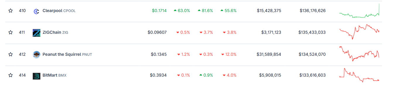 Dữ liệu của CoinGecko cho thấy vốn hóa thị trường của Clearpool đạt hơn 136 triệu đô la vào thứ Tư, vượt qua các altcoin phổ biến khác như ZIGChain (ZIG) và Peanut the Squirrel (PNUT), đảm bảo vị trí thứ 410 trong bảng tổng hợp vốn hóa thị trường tiền điện tử.