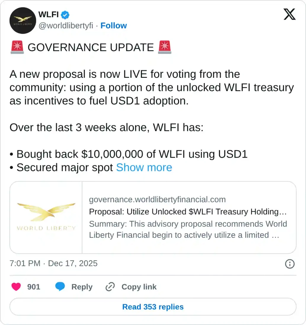 - Cộng đồng bắt đầu bỏ phiếu để giải phóng khoảng 5% quỹ dự trữ WLFI nhằm khuyến khích việc chấp nhận stablecoin USD1.
